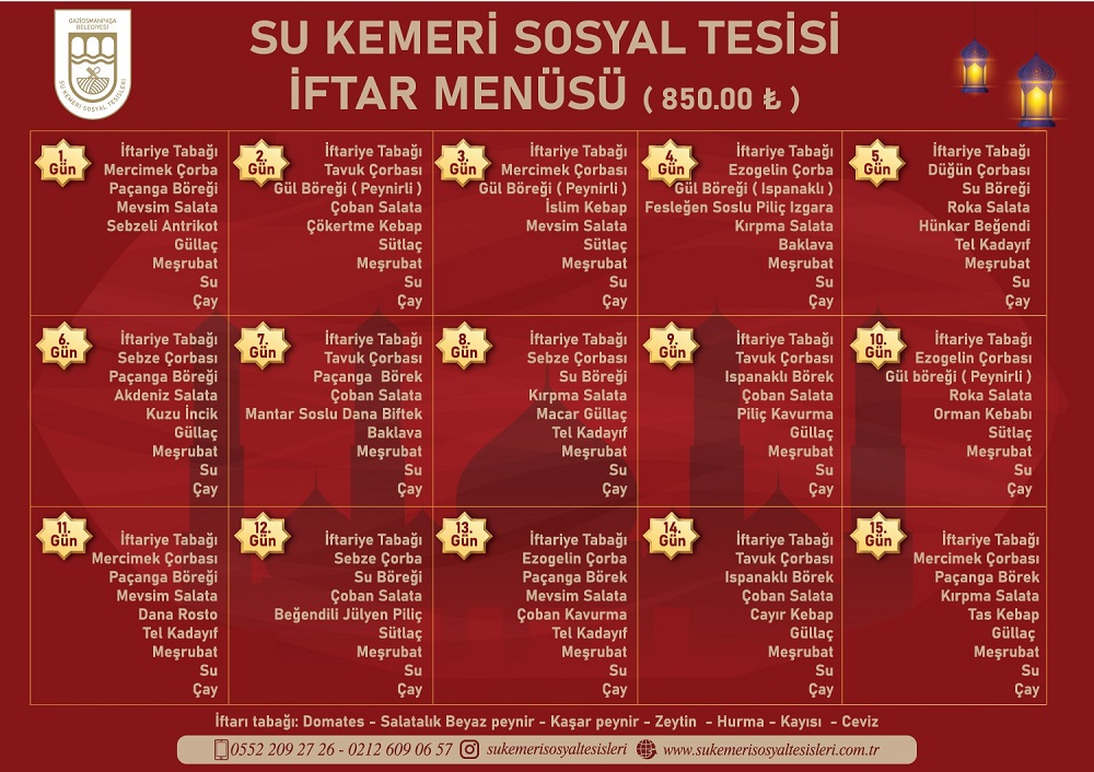 Ramazan’ın bereketini paylaşmak amacıyla ilçenin sevilen uğrak noktalarından Su Kemeri Sosyal Tesisi’nde, her güne özel hazırlanan iftar menüleri uygun fiyatlarla vatandaşlara sunulacak. Özenle hazırlanan menüler, geleneksel tatları modern sunumlarla buluşturacak. İftar saatinde misafirlere Osmanlı şerbeti ikramı yapılırken, aileler sıcak ve samimi bir ortamda oruçlarını açmanın huzurunu da yaşayacak. Ramazan ayı boyunca devam edecek iftar programlarıyla hem lezzet hem de paylaşma kültürü aynı sofrada buluşacak.