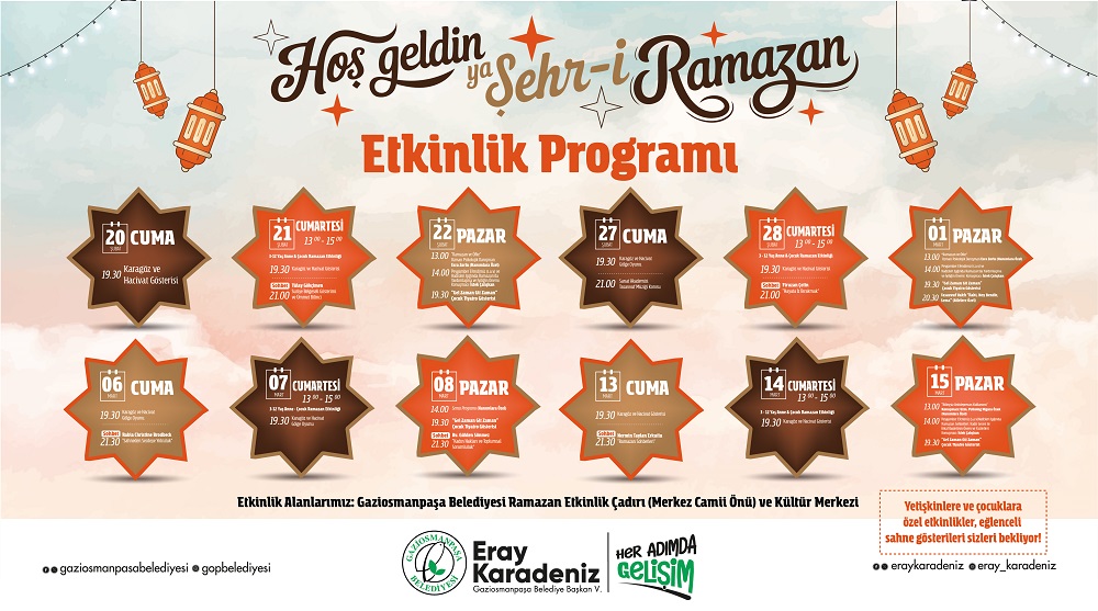 Gaziosmanpaşa Belediyesi’nin düzenlediği Ramazan ayı etkinlikleri, her yaştan vatandaşın katılımına açık olacak. Dini sohbetler, tasavvuf müziği dinletileri, kültürel ve eğitici atölyeler, çocuk gösterileri gibi birçok farklı program ile ilçenin dört bir yanı, Ramazan sevinci ile dolup taşacak.